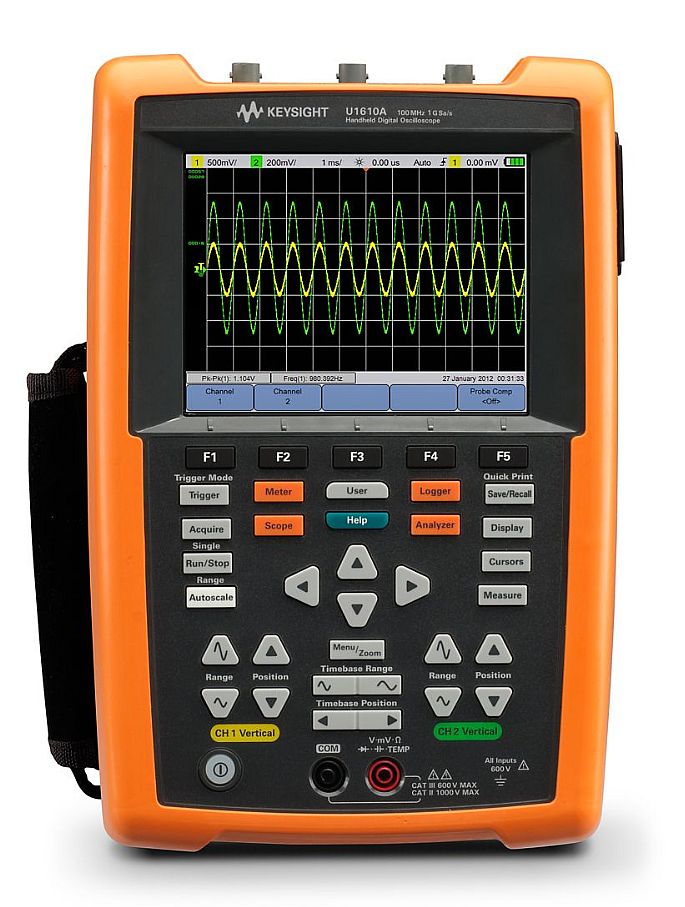Осциллографы U1610A являются первыми в мире ручными осциллографами с VGA дисплеем. Эти приборы имеют полосу пропускания 100 МГц и два изолированных входных канала, сертифицированных по CAT III 600 В, что обеспечивает безопасное измерение высокого напряжения без заземления. Максимальный объем памяти составляет 120 тыс. точек, что позволяет захватывать сигналы с широтно-импульсной модуляцией, броски напряжения, сигналы переходных процессов или последовательности запуска двигателя. Дисплей этих приборов похож на дисплеи настольных приборов. Он может иметь два окна с возможностью масштабирования: одно для обзора всей захваченной осциллограммы, а второе — для подробного анализа сигнала в выбранной области.